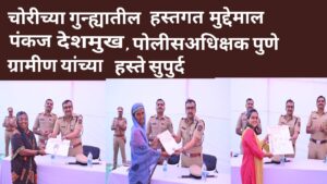 इंदापूर : मुख्यमंत्री देवेंद्र फडणवीस यांनी शासनाच्या विविध खात्यास आखुन दिलेल्या शंभर दिवशीय कृती कार्यक्रमाचे औचित्य साधून इंदापूर पोलीस स्टेशन हद्दीत चोरीस गेलेला दहा लाख तीस हजार रुपयांचा मुद्देमाल मुळ मालकास पंकज देशमुख पोलीस अधीक्षक पुणे ग्रामीण यांच्या हस्ते काल (दि.४ ) रोजी सुपुर्द करण्यात आला.