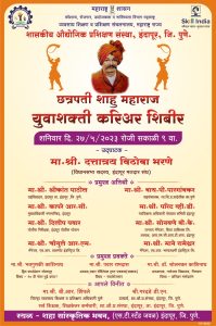 इंदापूर : उद्या शनिवार (दि.२७) रोजी शहा संस्कृतिक भवन इंदापूर येथे कौशल्य रोजगार उद्योजकता व नावीन्यता विभाग महाराष्ट्र, व्यवसाय शिक्षण व प्रशिक्षण संचालनालय, महाराष्ट्र राज्य , शासकीय औद्योगिक प्रशिक्षण संस्था इंदापूर जिल्हा पुणे यांच्या संयुक्त विद्यमाने छत्रपती शाहू महाराज युवाशक्ती करिअर शिबिर आमदार दत्तात्रय भरणे यांच्या उपस्थिती संपन्न होणार आहे. शिबिरास प्रमुख अतिथी म्हणून तहसीलदार श्रीकांत पाटील, नगर परिषदेचे मुख्याधिकारी कापरे आर. सी. , पोलीस निरीक्षक दिलीप पवार, गटविकास अधिकारी परीट व्हि. डि. हे प्रमुख प्रशासकीय अधिकारी उपस्थित राहणार आहेत व विद्यार्थ्यांना मार्गदर्शन करणार आहेत.