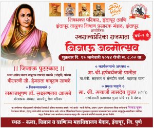 इंदापूर : शिवभक्त परिवार इंदापूर आणि इंदापूर तालुका शिक्षण प्रसारक मंडळ आयोजित स्वराज्य प्रेरिका राजमाता जिजाऊ जन्मोत्सवाचे दि. १२ जानेवारी २०२४ रोजी कला , विज्ञान आणि वाणिज्य महाविद्यालयाच्या प्रांगणात आयोजन करण्यात आले आहे. सर सेनापती प्रतापराव गुजर यांचे तेरावे वंशज सयाजी नामदेव गुजर हे या कार्यक्रमाला प्रमुख पाहुणे म्हणून उपस्थित राहणार आहेत. महाराष्ट्र राज्याचे माजी मंत्री व संस्थेचे अध्यक्ष हर्षवर्धन पाटील या कार्यक्रमाच्या अध्यक्षस्थानी आहेत. कामधेनु सेवा परिवाराचे संस्थापक अध्यक्ष समाजभूषण शिवव्याख्याते डॉ. लक्ष्मणराव आसबे यांचे व्याख्यान यावेळी होणार आहे. याप्रसंगी सर्व आजी-माजी सैनिक, एस.आर. पी. एफ., सी. आर. पी .एफ. यांच्या माता किंवा पत्नी यांचे जिजाऊ पूजन यावेळी करण्यात येणार आहे.