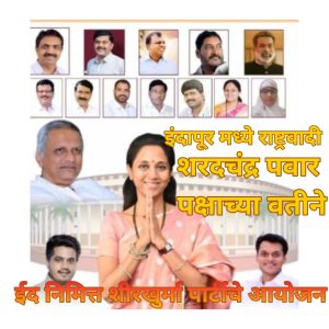 इंदापूर : सोमवारी (दि१५) रोजी राष्ट्रवादी काँग्रेस शरदचंद्र पवार पक्षाच्या वतीने इंदापूर येथे ईद निमित्त पक्षाच्या पदाधिकाऱ्यांच्या वतीने श्रीनिवास पवार यांच्या प्रमुख उपस्थितीत शीरखुर्मा पार्टीचे आयोजन दर्गाह- मस्जिद चौक इंदापूर येथे सायंकाळी करण्यात आले आहे.