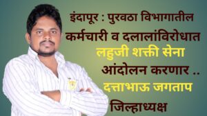 म्हणून पुरवठा शाखा इंदापूर येथील झिरो कर्मचारी तथा उमेदवार यांची कसून चौकशी करून त्यांच्यावर योग्य ती कारवाई करण्यात यावी. व पुरवठा शाखेतील त्यांना सामील असलेले पुरवठा निरीक्षक यांना पुरवठा शाखेच्या दरवाजासमोर बसून नागरिकांचा झिरो कर्मचाऱ्यांची संपर्क बंद करण्यात यावा. (इंदापूर तहसिलच्या अभिलेख कक्षामध्ये जी व्यवस्था करण्यात आली आहे.) त्याप्रमाणेच व्यवस्था पुरवठा शाखेमध्ये करण्यात यावी. अन्यथा या समस्येकडे शासनाचे गंभीरपणे लक्ष वेधण्यासाठी नाईलाज असतो संघटनेच्या वतीने आंदोलन केले जाईल असे पुणे जिल्हा लहुजी शक्ती सेना संघटनेचे अध्यक्ष दत्ताभाऊ जगताप यांनी सां