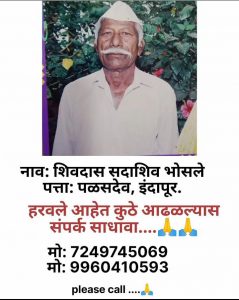 अंगात पोशाख – पांढऱ्या रंगाचे धोतर,ओपन शर्ट व टोपी असा असून चेहऱ्यावर पांढऱ्या रंगाच्या मिश्या व डोळ्यावर चष्मा असा आहे. कोणाला आढळून आल्यास इंदापूर पोलिसात संपर्क साधावा किंवा नातेवाईक यांच्याशी संपर्क साधावा असे आवाहन करण्यात आले आहे.